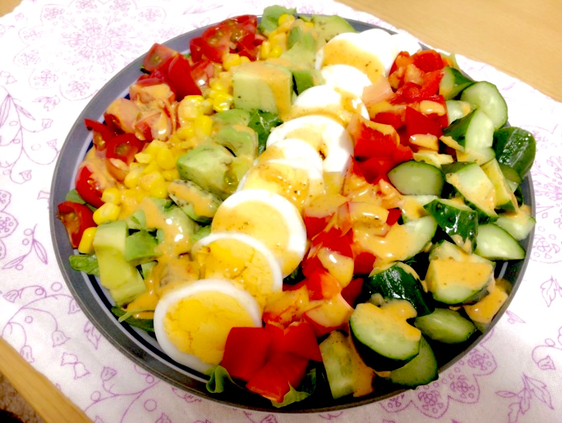 ダイエット食事 マヨネーズとラー油のスパイシーランチドレッシングと 野菜と肉で彩り豊かに このコブサラダは糖質6g以下です このレシピを参考に料理を作れば 必要以上に糖質量をオーバーしてしまうことはありませんし 安心して糖質制限ダイエットを続けることが