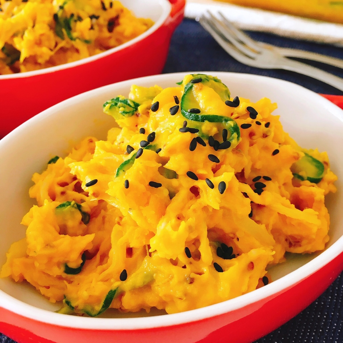 クリーミーでホクホクのかぼちゃとさつまいもがおいしい デリ風かんたんサラダ レンジ調理だけで作れてマヨネーズ不使用なので軽い仕上がりです カレー粉が香るから食べごたえも満足感もいっぱい 常備菜やおもてなしにぜひどうぞ レシピ 料理 レシピ かぼちゃ