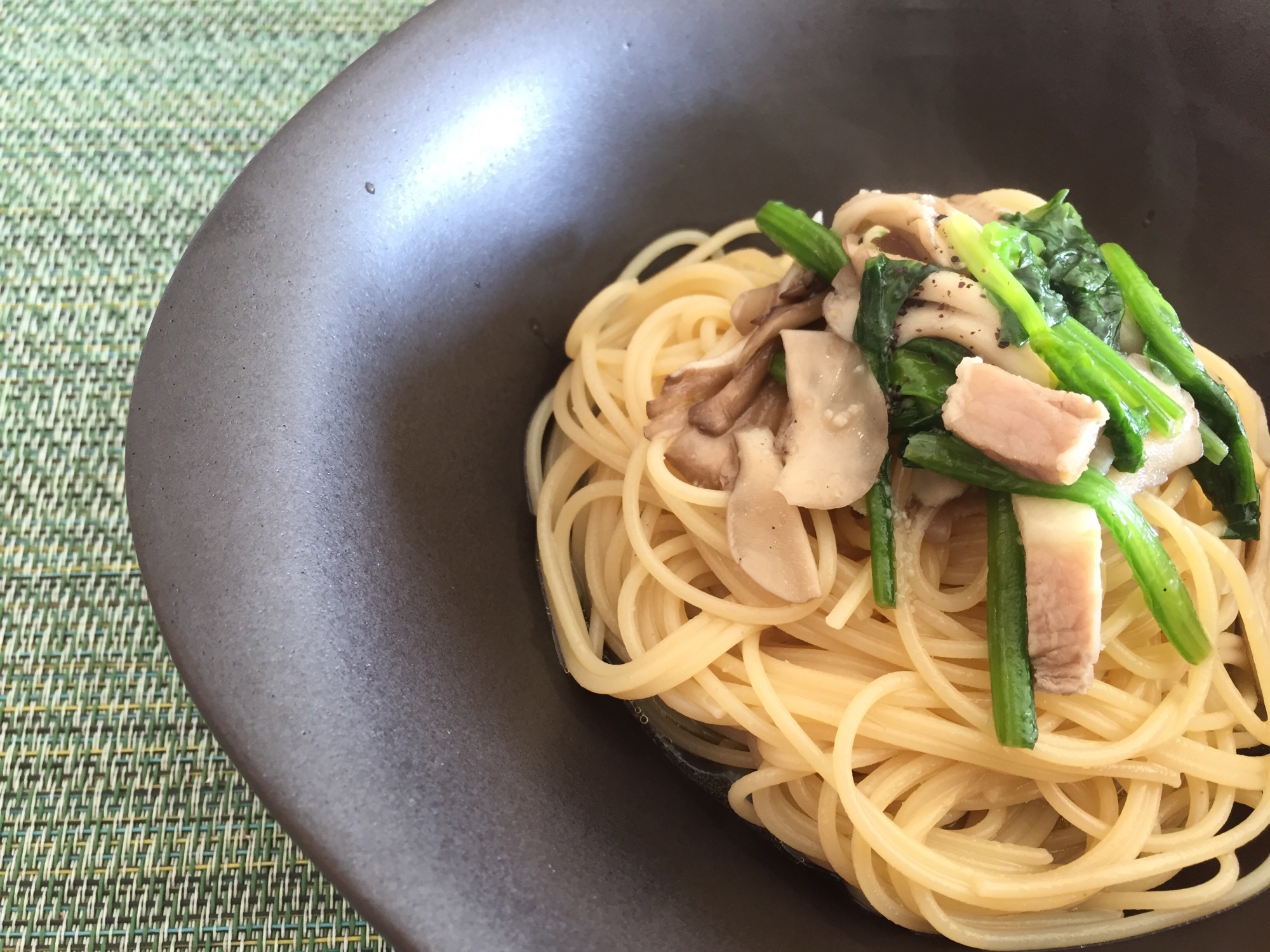 しめじと小松菜とベーコンの和風パスタ を市販のペペロンチーノソースをアレンジして作ります ぼちぼち歩く