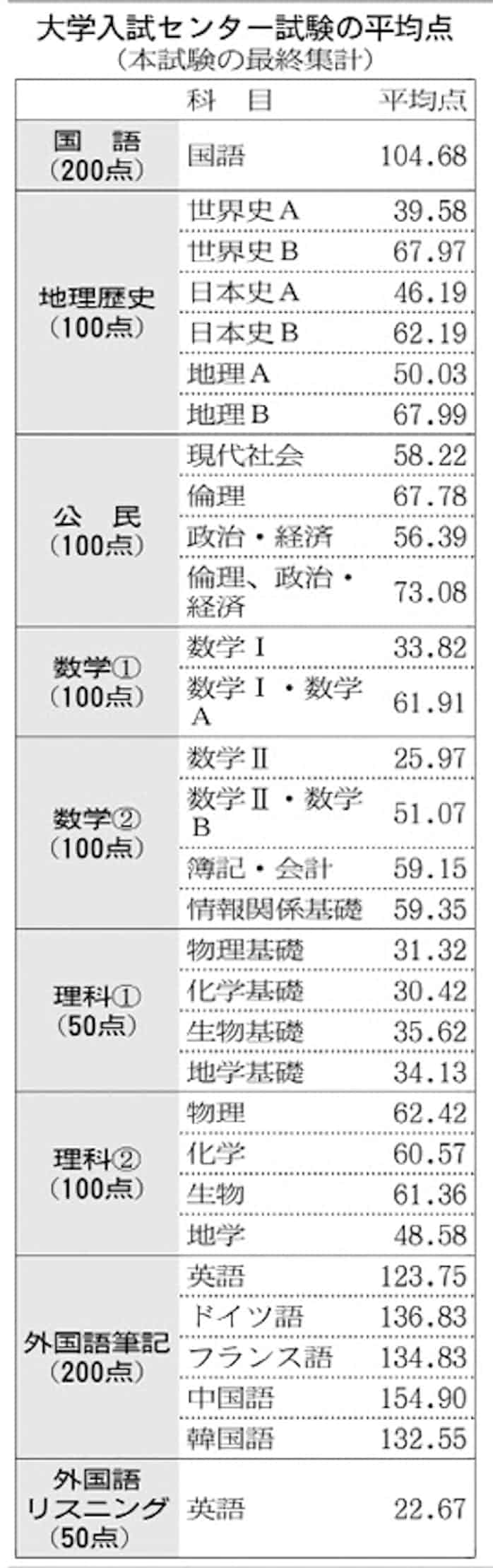 大学入試センターが17日に公表した、センター試験の平均点の中間集計は次の通り。()内の数字は満点 科目 平均点 国語(0点) 国語 102.36 地理歴史(100点) 世界史A 39.79 世界史B 70.18 日本史A 46.42. 予想平均点を科目別にみると、 平均点アップの科目は地理b、物理など である。 平均点ダウンの科目は数学Ⅰ・A、英語(筆記)など である。「得点調整」については、1月24日(金)に大学入試センターより正式発表される予定であるが、実施の可能性は. 年度センター試験平均点について ①各科目の平均点は大学入試センター発表値、ただし英語はそれぞれ100点に換算 ②総合型は東進推定 株式会社ナガセについて 1976年創立。.