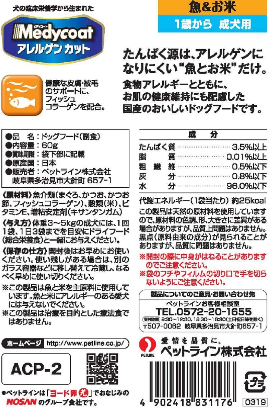 商品名 犬用 アレルゲンセレクトカット ブランド JPスタイル ダイエティクス 在庫 あり 原材料 中白糠、馬鈴薯でんぷん、かつお節粉、馬鈴薯たんぱく、脱脂大豆、大豆油、ビートファイバー、フィッシュオイル、煮干エキスパウダー、脱脂米糠、ミネラル類(カルシウム、リン、カリウム. メディコート アレルゲンカット パウチ 7歳から 高齢犬用 魚&お米(60g)の価格比較、最安値比較。最安値 87円(税込)評価:400口コミ:6件(1/17時点 商品価格ナビ)製品詳細:食物アレルギーに悩む愛犬のための食事。魚とお米を原材料に使用し、味にうるさい愛犬も満足な. メディコート アレルゲンカット パウチ 7歳から 高齢犬用 魚&お米(60g)の価格比較、最安値比較。最安値 87円(税込)評価:400口コミ:6件(1/17時点 商品価格ナビ)製品詳細:食物アレルギーに悩む愛犬のための食事。魚とお米を原材料に使用し、味にうるさい愛犬も満足な.