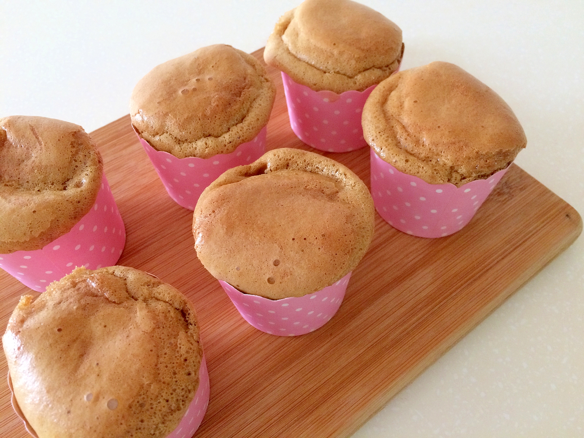 さらさら テスト勉強を頑張った娘に シフォンケーキを焼いた 車の中で食べることになるのでマフィンカップで作った マフィン カップだと焼きあがった後逆さまにできないから 時間が経つと少し高さが下がる 竹串に刺して逆さまにできるけど表面に穴が
